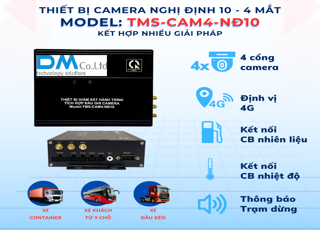 - Chức Năng Rao Trạm: TMS-CAM4-NĐ10 được tích hợp thêm chức năng phát thông báo bằng giọng nói qua loa phát thanh, thích hợp cho xe buýt công cộng, xe du lịch từ 9 chỗ.